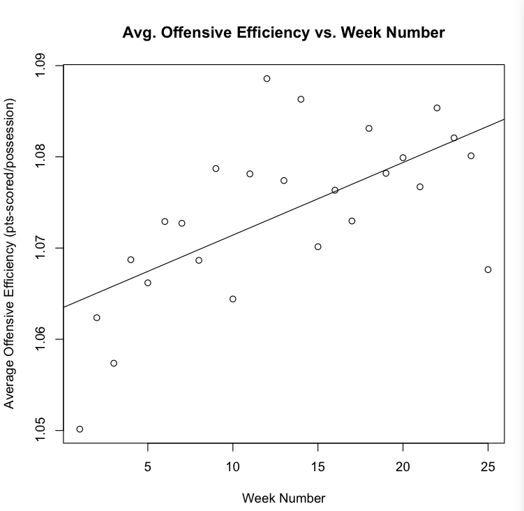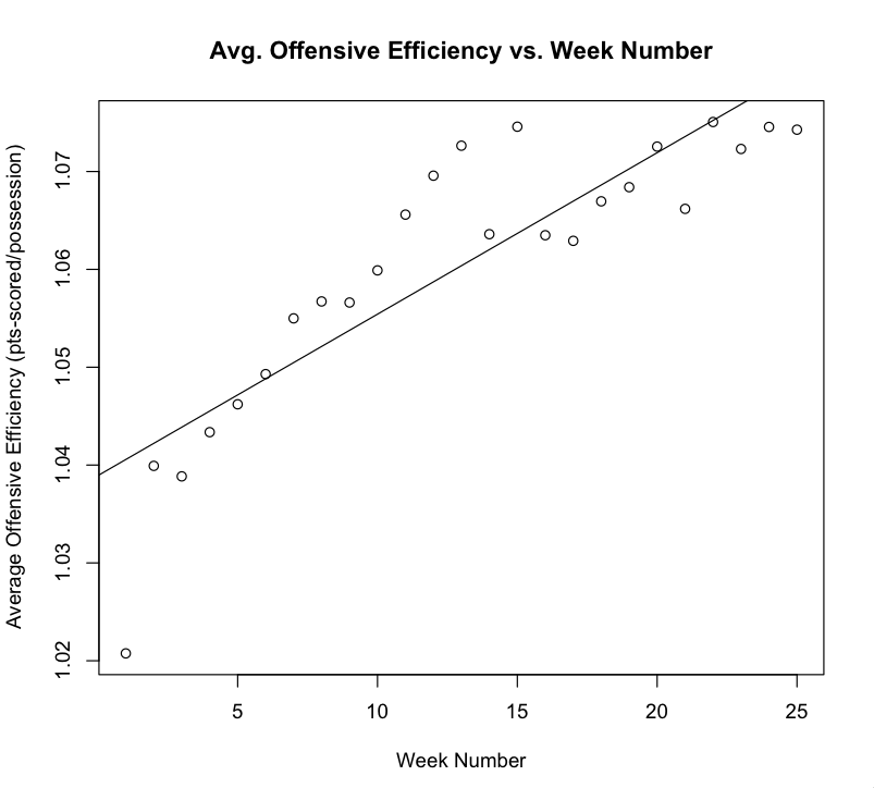 Well, the title of the post is pretty self explanatory. I just ran a simple linear regression with week-number (25 weeks in a season) along the x-axis and offensive efficiency along the y-axis. Here is an image of the resulting graph: http://4.bp.blogspot.com/_ldfrs9-ffs0/TPfGIY-BR9I/AAAAAAAAAAM/1TvnxF8EOH0/s1600/offeffgraph2.png.